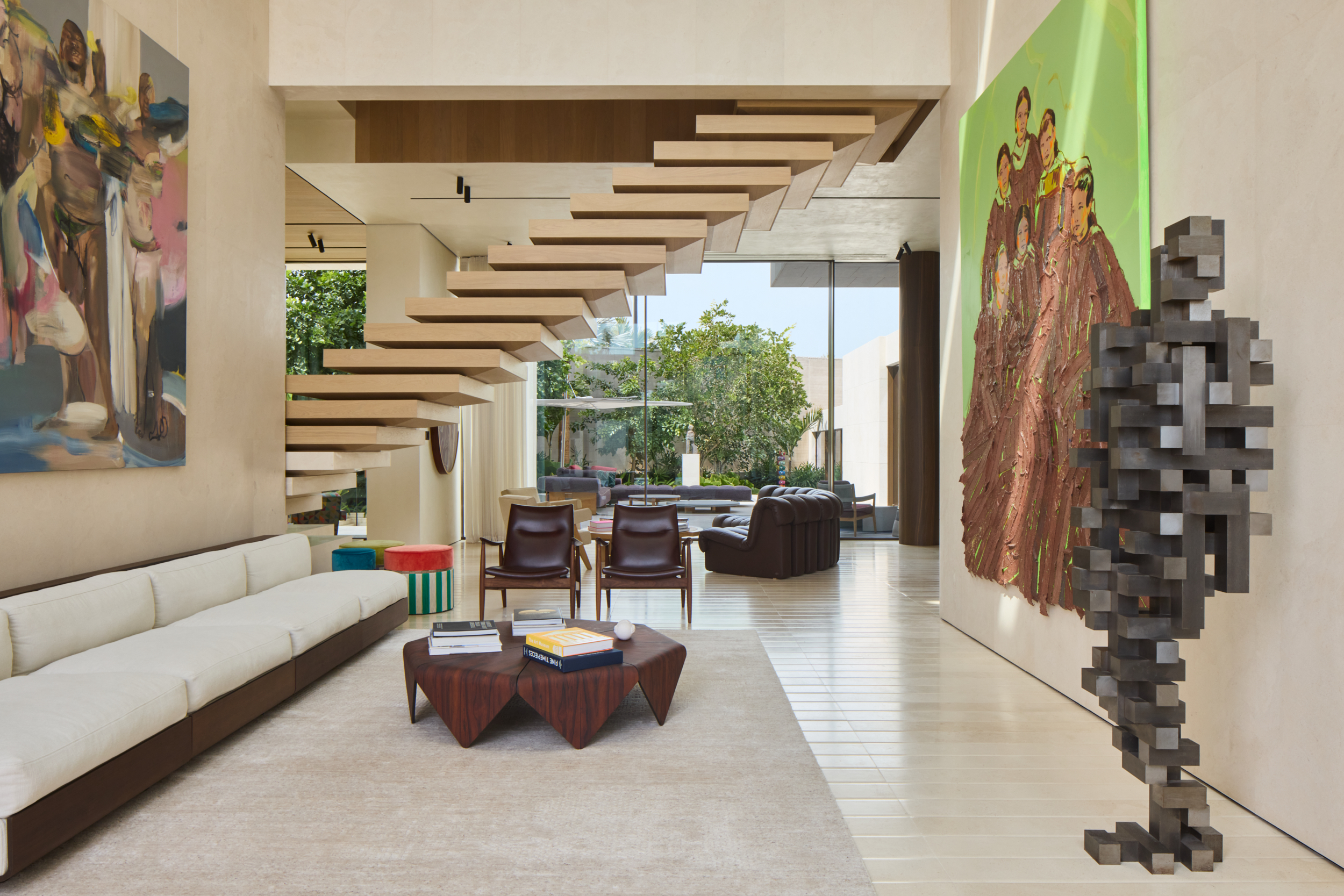 The architectural centerpiece is the staircase in the central double volume of the house, designed to appear as though it’s floating, a feat achieved through meticulous structural planning. Beneath it, playful design details, from striped stools to colourful art books, add warmth and personality to the refined setting.